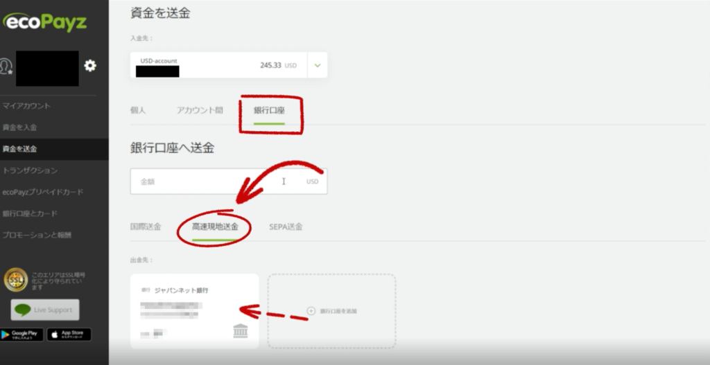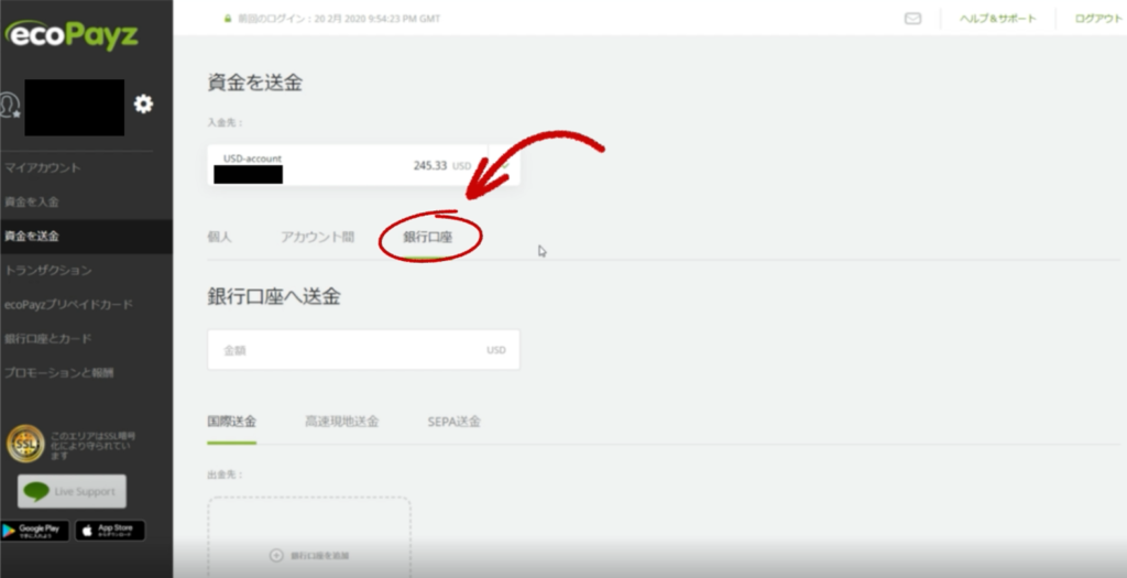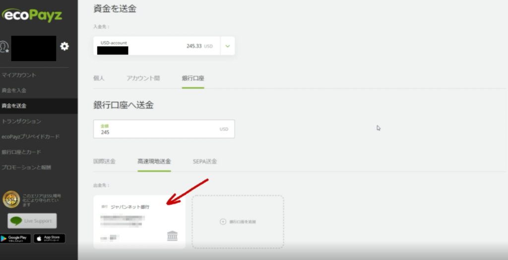 すると一番下に登録してある日本の銀行口座が現れます!