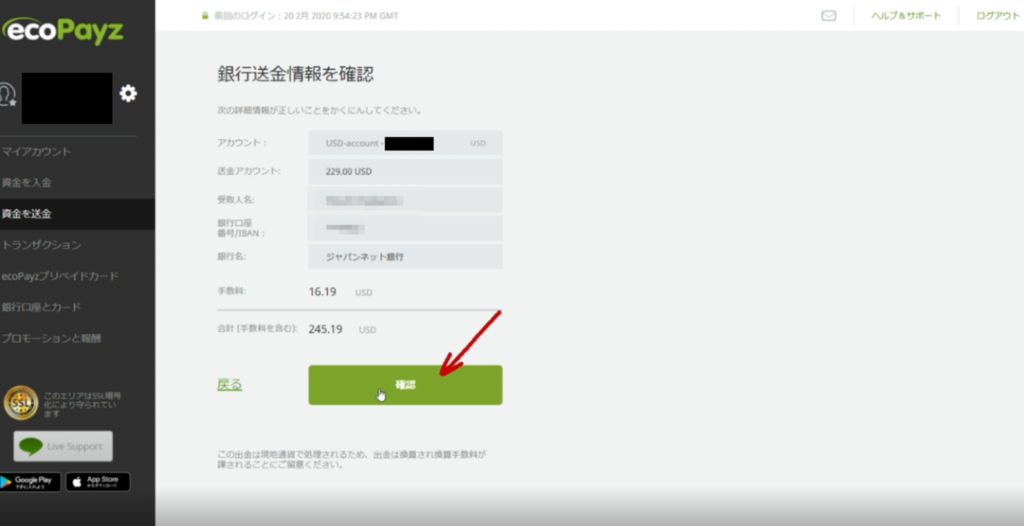 送金手続きをしたのが、日本時間の2020年2月21日金曜日の午後3時ごろでした。