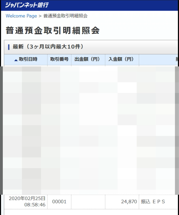 25日の朝メールが来てました、確認の為ジャパンネット銀行の履歴を確認してみました。